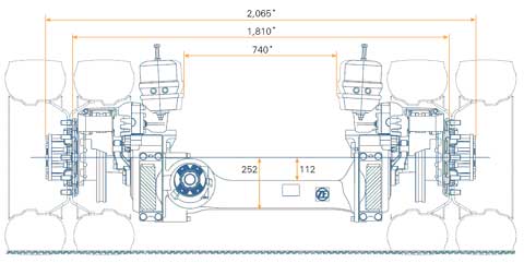 ZF供应完整的AV132门式车桥系统,除了带有盘式或者鼓式制动器以外,还包括悬挂所需的所有部件,例如气囊,减震器及ABS/ASR和制动磨损传感器。AV132在轮边实现了可装配的轴头轮毂单元,这样单个车桥就可以减少10kg的重量,整个车桥桥的重量不到800kg。同时易维护的轮毂单元可以减少更换制动蹄的时间。独特的锥齿轮传动确保运转平稳。门式桥内的两级传动使驱动桥的设计更加紧凑,低桥壳和偏置差动器的布置为无台阶的车厢提供了更大的空间。AV132有多种型号以满足当前各种车辆传动系的应用需求。