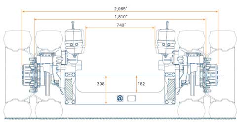 针对超长铰接车设计的门式支撑桥 AVN132,可作为中间支撑桥与ZF的其它公交用车桥配合使用。