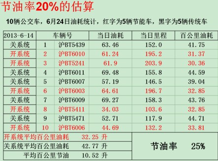 通过油耗计量仪及公交公司的加油记录,在上海某公交示范线上运营一年来,实测节油率大于20%。以某天的对比数据为例: