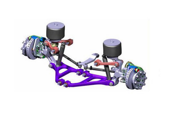 Þ 高刚度双A臂结构、宽气囊跨距、非簧载质量低,动载冲击较小,三段式转向机构