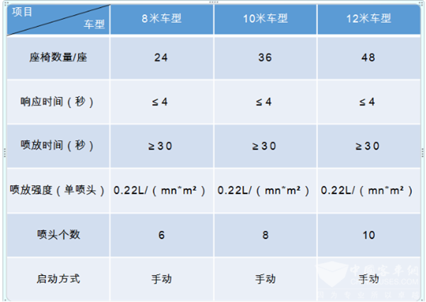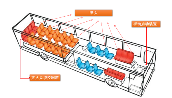 公共汽车客舱灭火系统与传统灭火设备不同,灭火剂喷射角度和喷口安装位置要针对客舱火灾特点设计,在拥挤人群中要将灭火剂全部喷射到火焰上,而不被乘客的头部、衣服吸收掉,是成功灭火的关键。