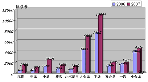 表一:2007年大型客车销售增长前10名企业排名表 单位:辆