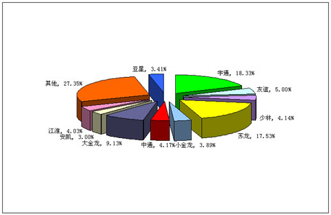 图一:2008年前2月中型客车销售前10名市场份额图