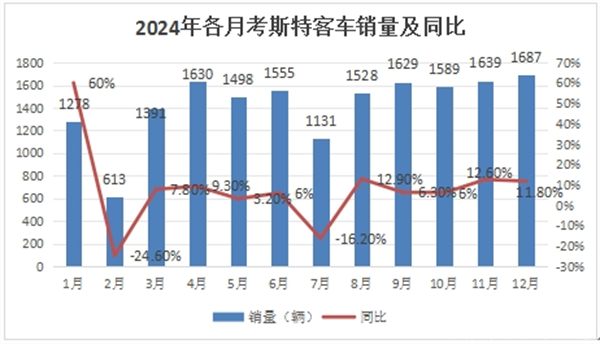 根据终端上牌数据,2024年1-12月各月考斯特客车销量及同比: