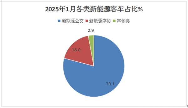 按目标用途划分,2025年1月7米以上大中型新能源公交客车销售2103辆,同比增长34.72%,占据大中型新能源客车大盘79.1%的市场份额;2025年1月大中型新能源座位客车销售481辆,同比增长12.38%,占据大中型新能源客车大盘18%的市场份额;2025年1月其他类大中型新能源客车销售76辆,同比大涨245.45%,占据大中型新能源客车大盘2.9%的市场份额.