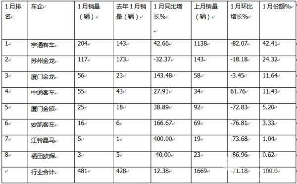 ---宇通客车销售204辆,也是唯一销量超200辆的车企,同比增长42.66%,跑赢大盘;环比下降82.07%,跑输大盘,市场份额为42.41%,以绝对的优势夺得销量冠军;