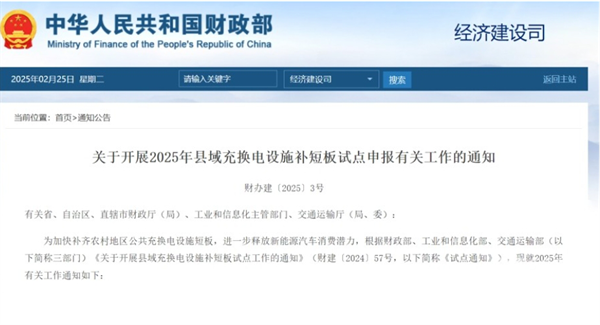 三、财政部等3部门关于开展2025年县域充换电设施补短板试点申报有关工作的通知
