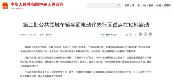 2025年2月下旬,工业和信息化部、交通运输部等八部门启动第二批公共领域车辆全面电动化先行区试点,支持天津、常州、无锡、宜宾、临沂、淮南、西安、咸阳、渭南和雄安新区等10地深入开展车网互动、光储充换、智能网联等新技术新模式创新应用。根据工作计划,新能源汽车推广领域包括公务用车、出租车、城市公交车等,预计10地新增推广新能源汽车超过25万辆,建设充电桩超过24万个,预计每年节省燃油超过140万吨,碳减排超过450吨。