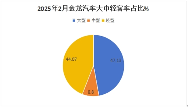 ---从产品销售结构来看,今年2月份,金龙汽车大型客车销量最多(占比47.13%),成为今年2月金龙汽车市场的主体部分;中型客车销量占比只有8.8%居最小,轻型客车占比44.07%,居第二;