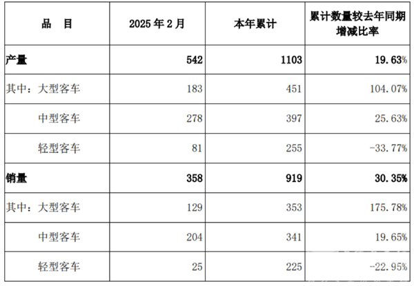 近日,宇通客车股份有限公司发布2025年2月份产销数据快报。