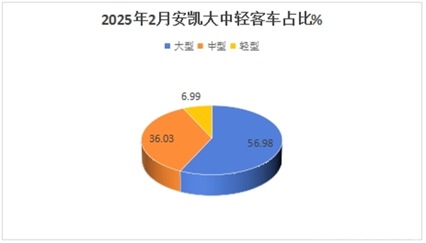 ---从产品销售结构来看,今年2月份,安凯中型客车销量最多(占比56.98%),成为今年2月安凯客车市场的主体部分;大型客车销量占比36.03%居第二;轻型客车占比6.99%,居最少;