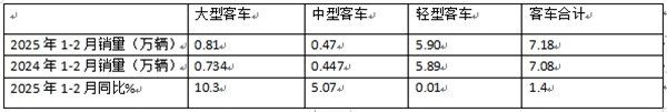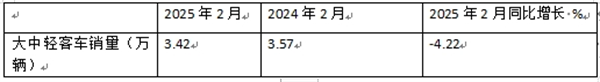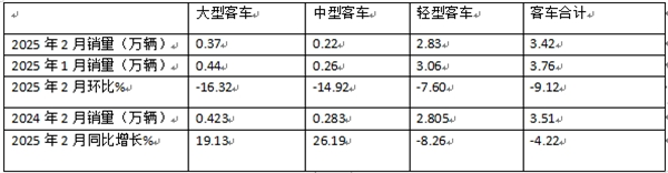 表1、2025年2月大中轻客车同比下降4.22%(数据来源:商用车专业委员会提供的批发信息):