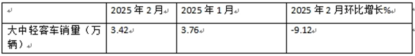 ---2025年2月我国大中轻客车环比下降 9.12%,主要是因为今年1月销量基数较高,加之今年2月有效工作日比今年1月少了3天(2月没有29日和30日和31日),因此影响了今年2月车企对客车市场的拓展和销售。
