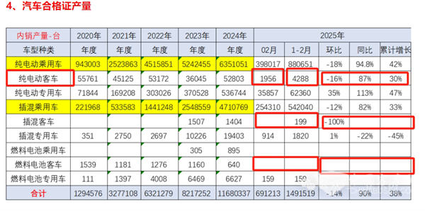 从截图3可知,2025年2月各类技术路线新能源客车装机量中:只有纯电动客车有装机量,同比增长87%、环比下降16%。