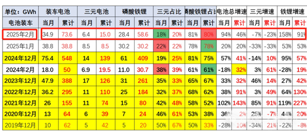 2025年前2月我国动力电池装机量共计73.6GWh,累计同比增46%;