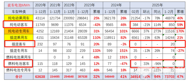 值得关注的是, 2025年2月我国新能源客车动力电池装机量大约为384MWh(将截图3中2025年2月份的纯电动客车装车量384MWh+2025年2月的插电式混动客车装车量0MWh+2025年2月的燃料电池客车的装车量0MWh) ,同比(2024年2月新能源客车装车量为179MWh)增长114%;2025年前2月新能源动力电池累计装机量大约为870MWh,同比增长56.8%。