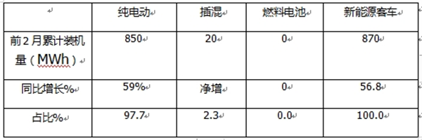 二、2月及前2月新能源客车动力电池装机量整体情况简析