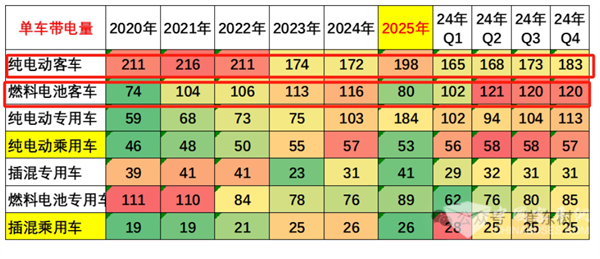---2025年1-2月燃料电池客车单车平均带电量为80KWh。居于近年中最低水平。