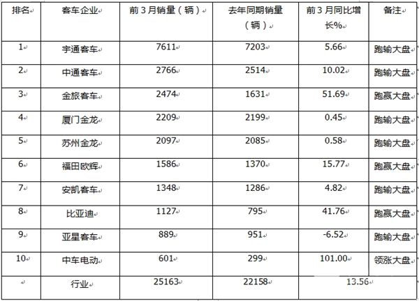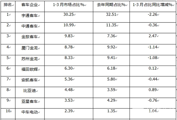 总之,今年前3月前10车企市场占比同比4增6降,其中金旅客车占比同比增加最多。