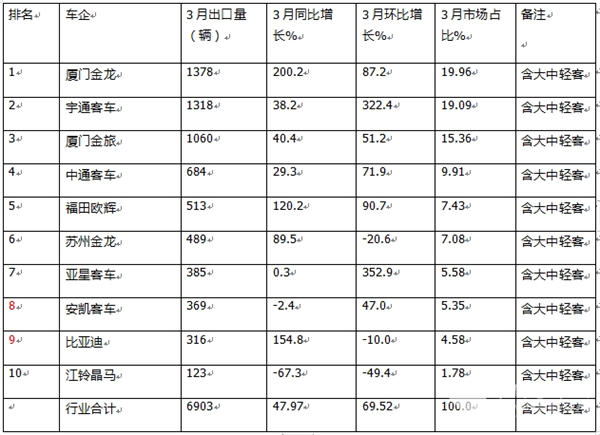 表1,根据中国客车统计信息网数据,2025年3月客车出口TOP10排行: