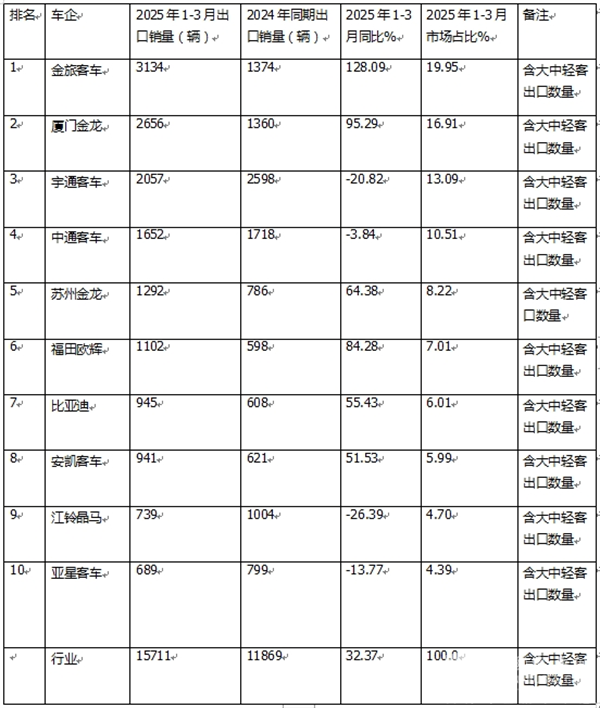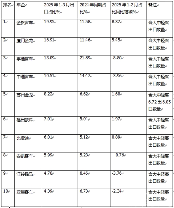 上表显示,在2025年前3月前10车企客车出口市场中: