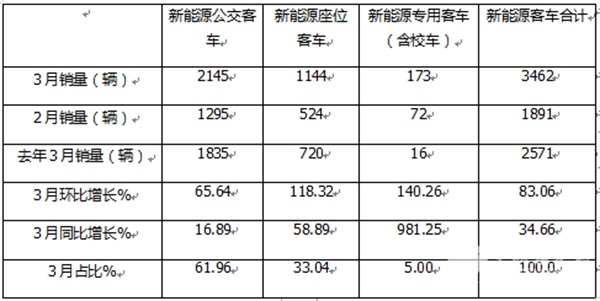上图表显示,在今年3月7米以上新能源客车各细分市场同环比中,新能源公交客车同环比增速分别为16.89%和65.64%;而新能源座位客车同环比增速分别为58.89%和 118.32%;新能源专用客车(含校车)同环比增速分别为981.25%和140.28%。可见新能源公交客车同环比增速均是最低的细分市场,双领跌各细分市场。主要是因为去年同期和上月新能源公交客车销量基数较高导致的。