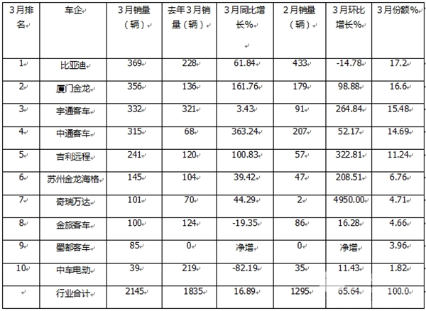 总之,在今年3月7米以上新能源公交客车市场竞争格局中,比亚迪夺冠,金龙\宇通居前三,TOP10销量同比8增2降,中通客车超3.6倍领涨;环比9增1降,奇瑞万达领涨(暴增4950%)。