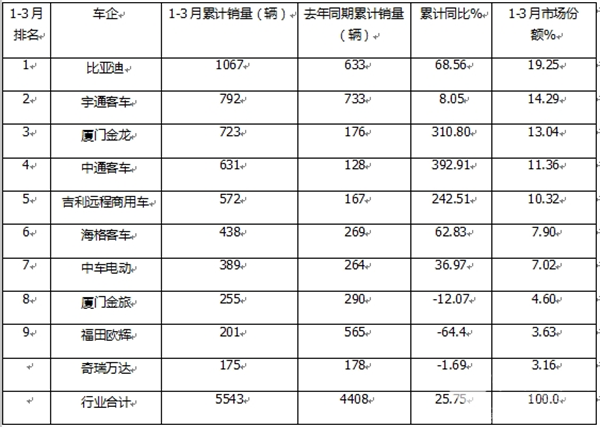 三、1-3月累销:比亚迪、宇通、金龙居前三 ;TOP10累计同比7增3降,中通领涨