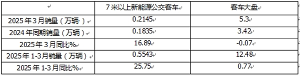 上表显示,2025年3月7米以上新能源公交客车同比增长25.75%,远远跑赢2025年3月客车大盘-0.07%的增幅,主要是新能源公交车依旧换新补贴政策的刺激所致。而今年1-3月7米以上新能源公交客车同比增长25.75%,也远跑赢今年1-3月客车大盘0.77%的增速。