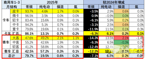 表3,根据截图2数据可知,2025年一季度国内大、中、轻客传统动力(常规动力)占比及占比同比增减: