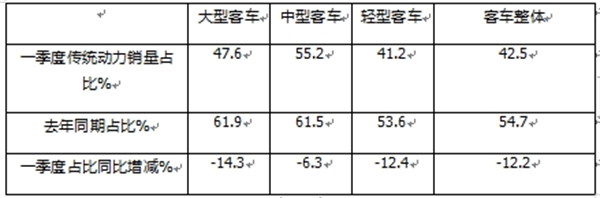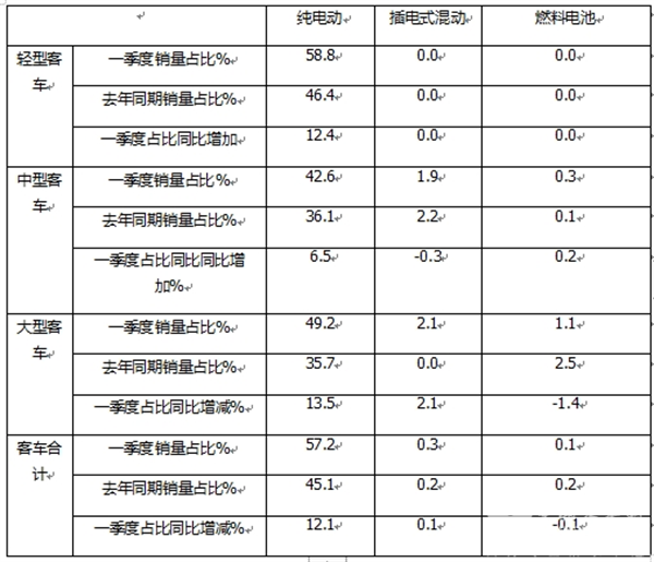 总之,在今年一季度国内新能源客车销量中,轻客电动化率最高、大客电动化进程加速最快;大客插混及燃料电池占比最高。