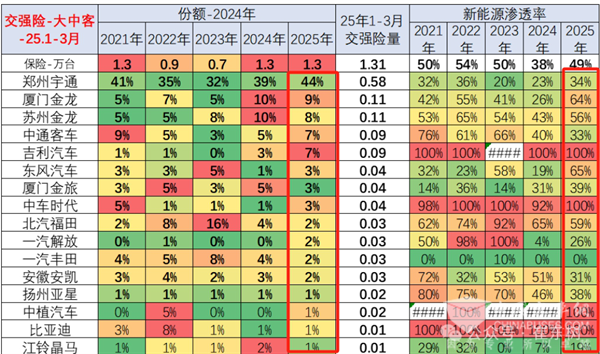 截图3,2025年一季度国内大中型客车各车企市场占比及新能源渗透率(来源:中国汽车流通协会提供的上牌信息)