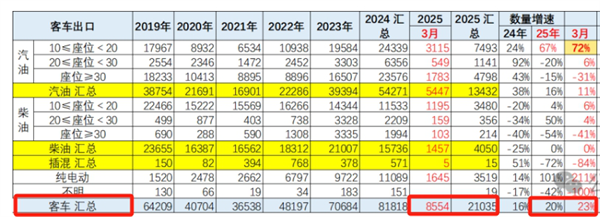 根据中国汽车流通协会提供的海关数据,2025年3月我国客车出口8554辆,同比增长23%;2025年1-3月我国客车累计出口20135辆,累计同比增长20%(见截图1)。