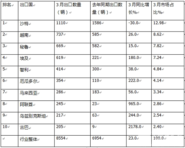 上表显示,2025年3月我国客车出口到TOP10国家中,出口数量同比及市场占比: