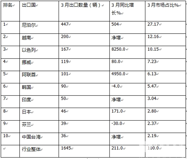 ---出口到尼泊尔国447辆,居第一,也是唯一出口数量超400辆的国家,同比增长504%,跑赢出口大盘,市场占比27.17%;