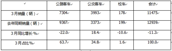据分析主要是去年同期销量基数较高,给今年3月同比增长带来压力;另外就是今年3月旅游客运市场相对企稳,对公路客车的需求相对减少;同时,公路客车特别是轻型公路客车依然是短途接驳和中小型团体包车的主要需要车型,导致其市场占比超6成而领跑。