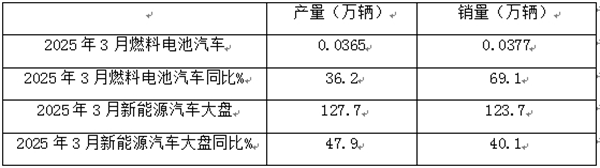 截图1,2025年3月燃料电池汽车及新能源汽车产销同比(数据来源:中汽协)