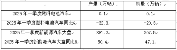 表1,根据中汽协数据,2025年一季度燃料电池汽车产量同比统计: