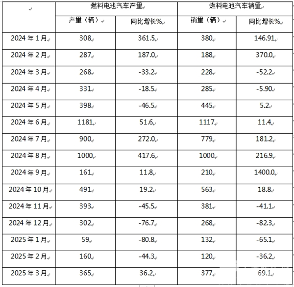 根据中汽协数据,2025年3月我国燃料电池汽车产销分别为365辆和377辆,同比分别增长36.2%和69.1%。