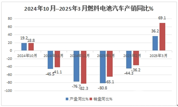 从上图表可见,从2024年11月--2025年2月我国燃料电池汽车产销同比已经连续4个月均呈现双双下降的走势,而到2025年3月,燃料电池汽车产销同比均转为正增长,一举扭转了之前的4连“双降”。主要原因上是今年3月市场大环境有所好转,各城市群推广燃料电池汽车的积极性有所增加,加之去年同期销量基数较低,给今年3月燃料电池汽车产销同比呈现双增长提供了支持。
