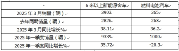 表3,2025年3月及一季度燃料电池汽车销量同比与6米以上大中型新能源客车大盘比较(数据来源:中国客车统计信息网及中汽协)