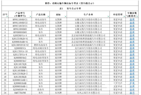 上图可见,在交通部第75批上榜的达标的道路运输客车车型公告中: