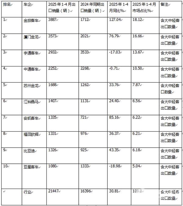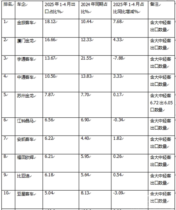 表2,根据中国客车统计信息网数据,2025年1-4月客车企业整体出口TOP10累计销量、同比及市场占比统计:
