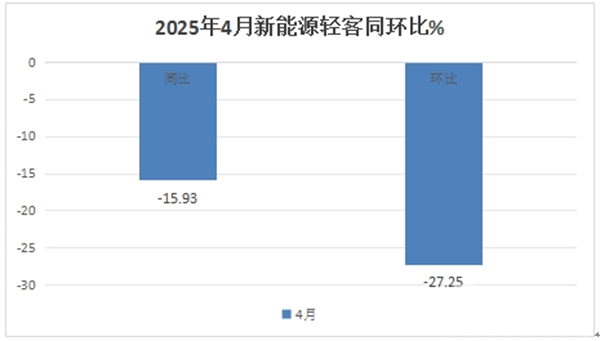 根据终端上牌数据,2025年4月我国新能源轻客实销18477辆(含4.5米—7米车型,以4.5米—6米封闭厢式的轻客物流车型为主体,下同),同比下降15.93%,环比下降27.25%,可见今年4月新能源轻客呈现同环比“双降”遇冷!