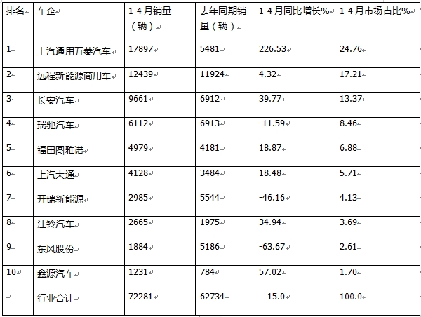 上表显示,在2025年1-4月新能源轻客累计销量中: