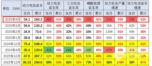 根据中国汽车流通协会提供的数据(见截图2),2025年4月我国动力电池装机量共计54.1GWh,同比增53%;