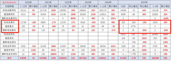 值得关注的是, 2025年4月我国新能源客车动力电池装机量大约为325MWh(将截图3中2025年4月份的纯电动客车装车量325MWh+2025年4月的插电式混动客车装车量0MWh+2025年4月的燃料电池客车的装车量0MWh) ,同比(2024年4月新能源客车装车量为396MWh)增长-18%;2025年前4月新能源动力电池累计装机量大约为1659MWh,同比增长20%。