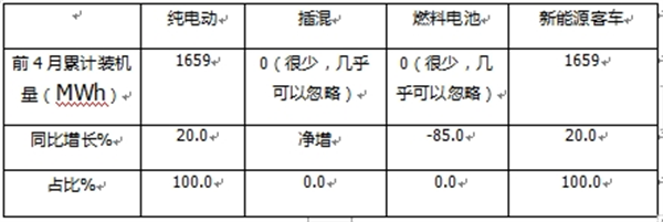 从今年前4月累计同比增速看,纯电动客车产量累计同比下降2%,插电式混动客车累计产量同比为净增,燃料电池客车累计产量同比下降100%。