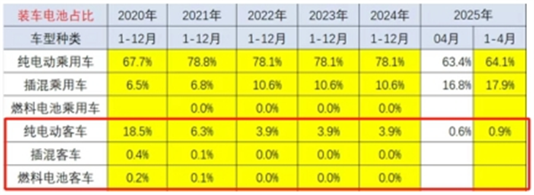 ---燃料电池客车动力电池装机量占据新能源汽车大盘的比例很少,从2020年的0.2%占比下降到2021年的0.1%占比,然后从2022年到2025年前4月占比均为零。