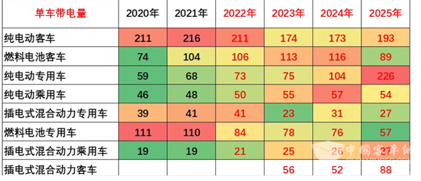 截图4,2025年前4月及近5年各类新能源客车单车平均带电量比较(数据来源:中国汽车流通协会提供)